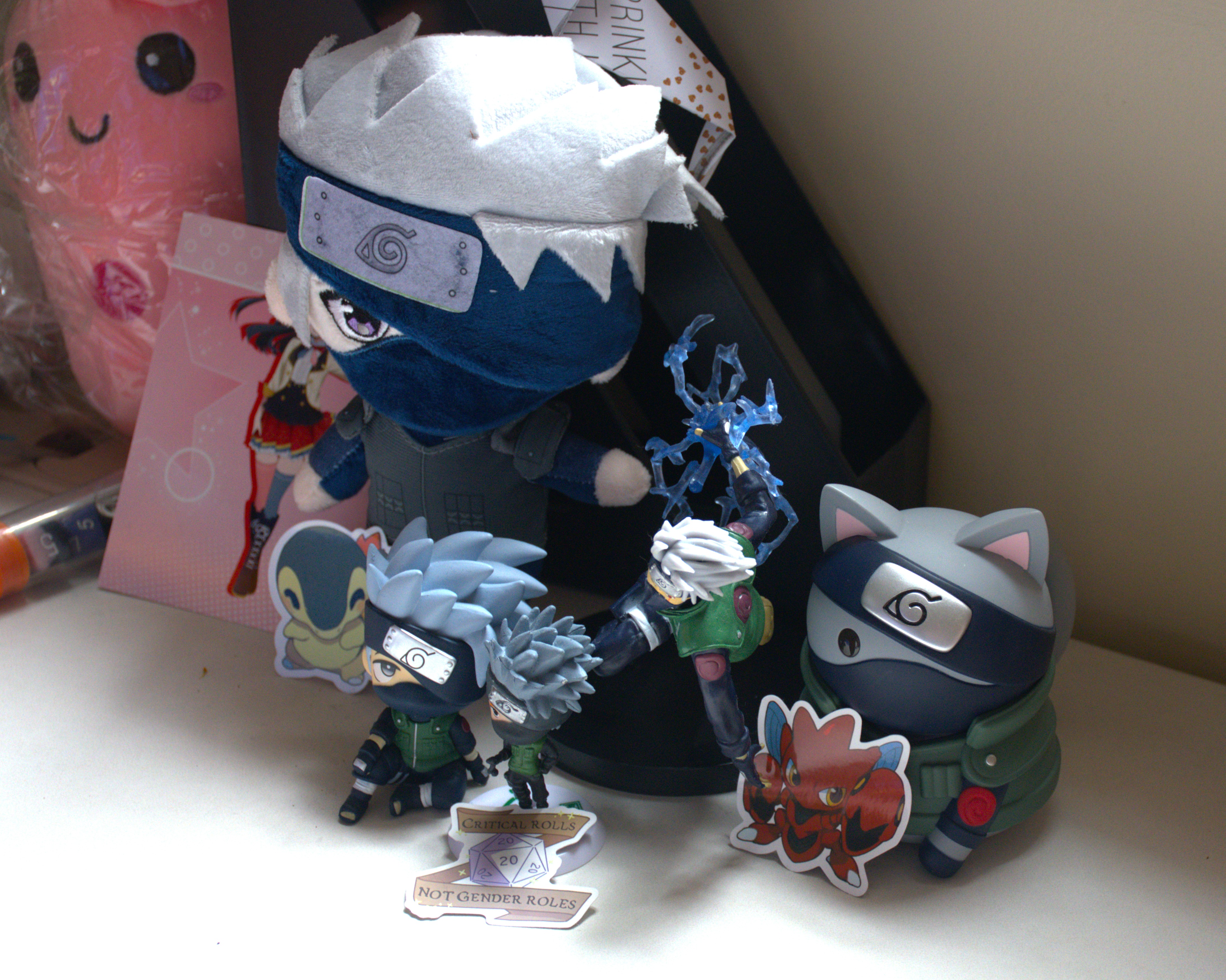 You dress up as Kakashi a few times for work, and before you know it family and patrons have covered half your desk in his likeness. -Brent