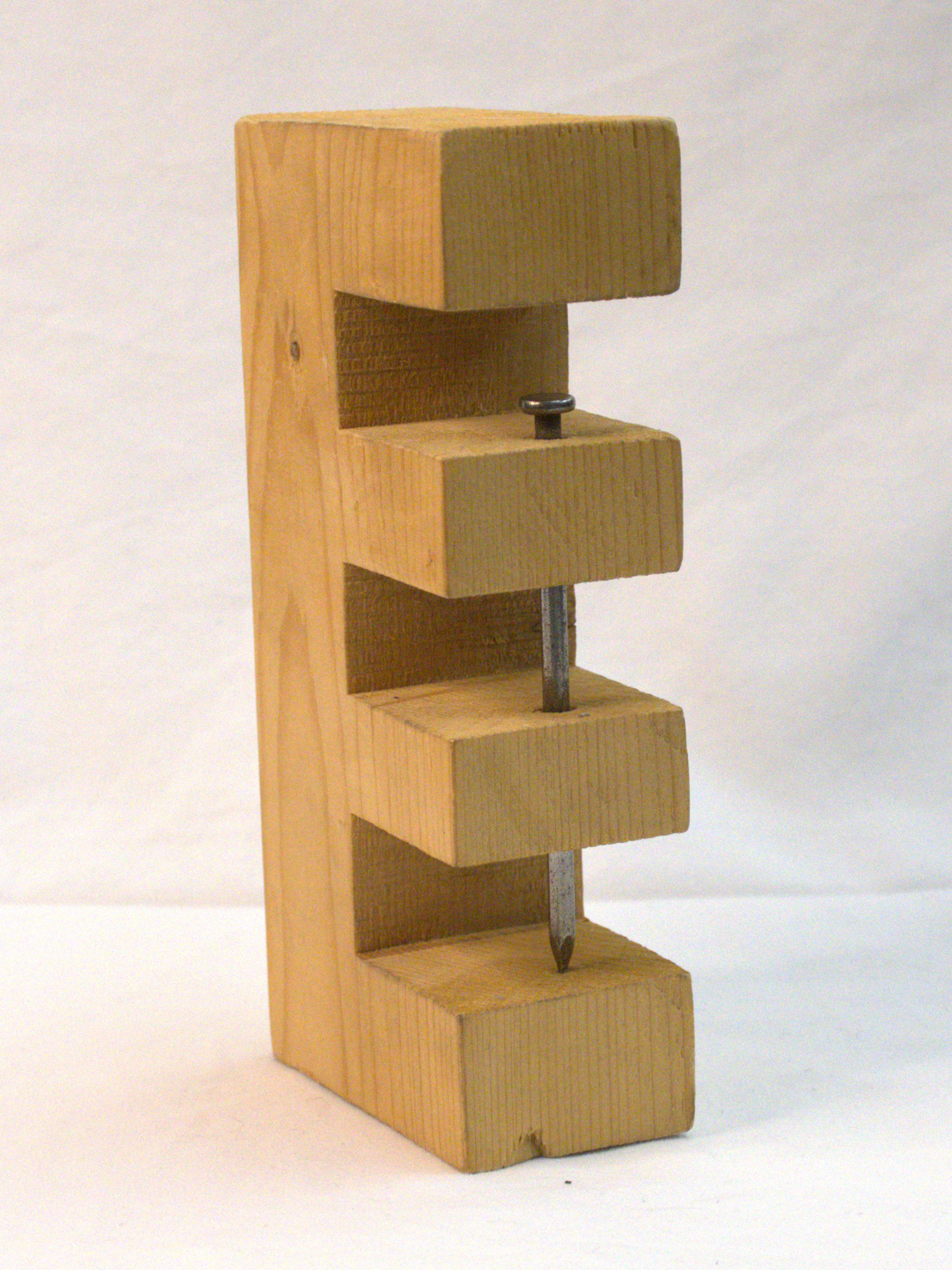 [A single piece of wood cut into the shape of a capital E, but with an extra stem. There is a nail going through the two middle stems; it is unclear how the nail got there without damaging the outer stems.]