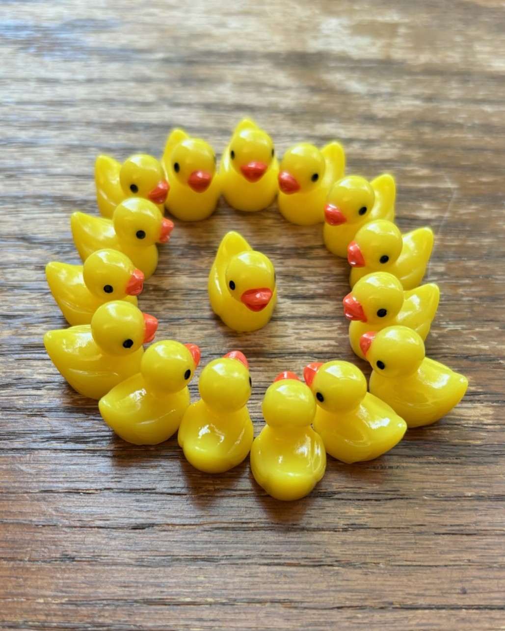 [A circle of tiny resin ducks in the style of rubber ducks. One duck is in the center of the circle. RIP.]
