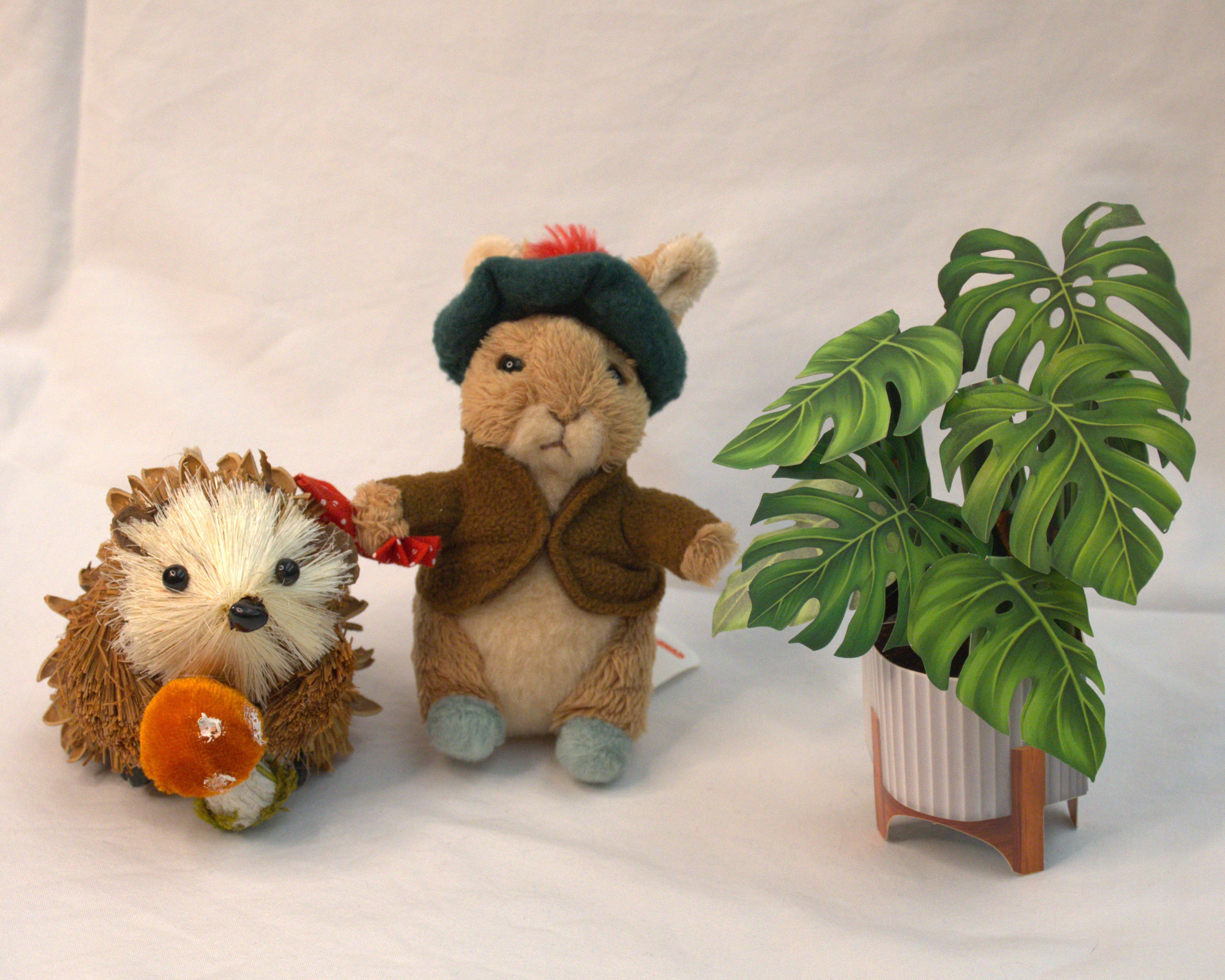 [A hedgehog made from pinecone-like material holding a mushroom; a small stuffed Benjamin Bunny from the stories of Beatrix Potter; a small paper monstera plant.]