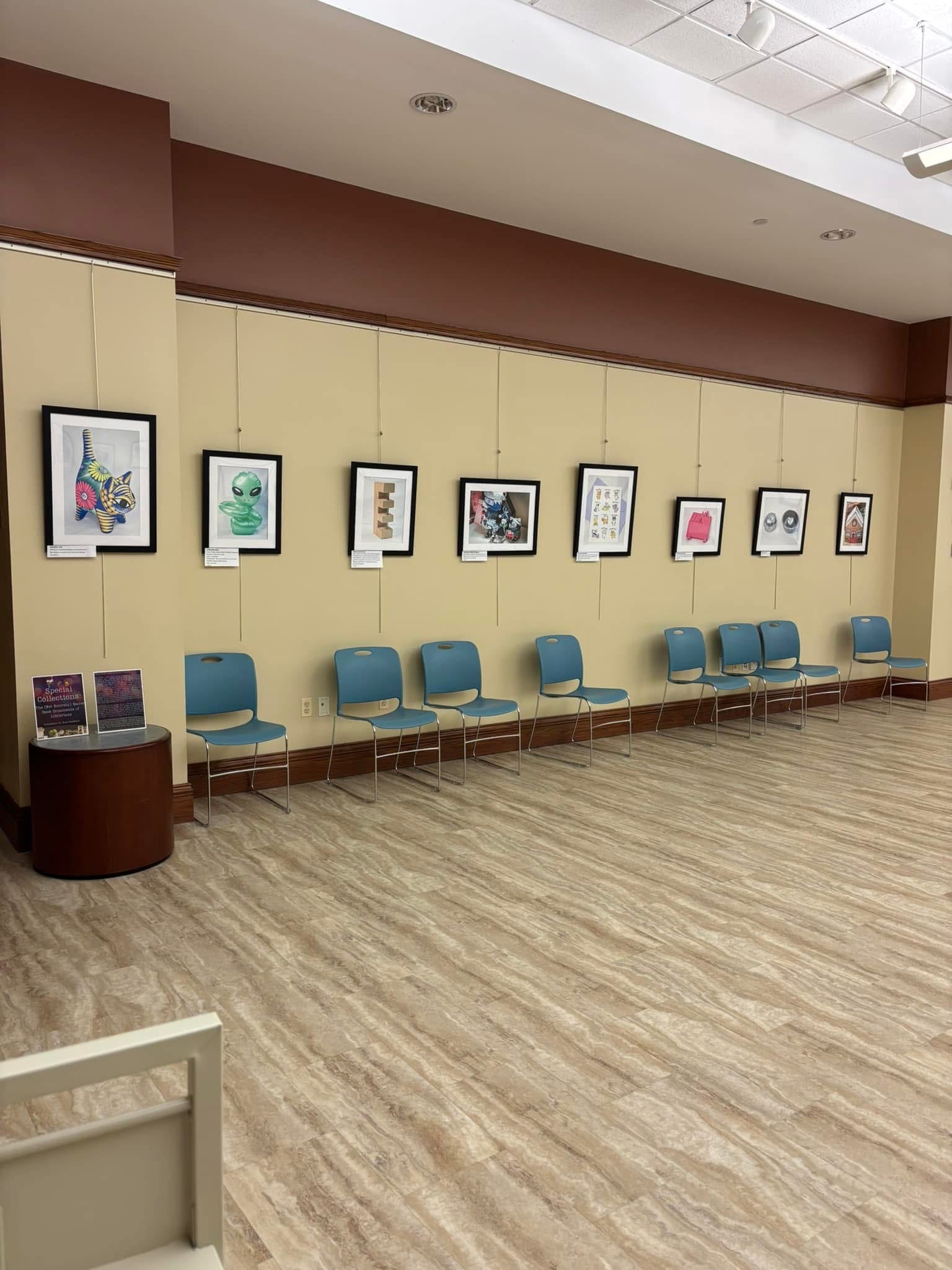 An image of a section of the Special Collections exhibit hanging in the Community Room. Framed images are: Ceramic Cat; Alien; Wood & Nail Puzzle; Collection of Kakashi Figures; Cat Thank You Card; Flaming Pink Dumpster; Pewter Truffle; and 1BR/0 Bath, $2k/month.