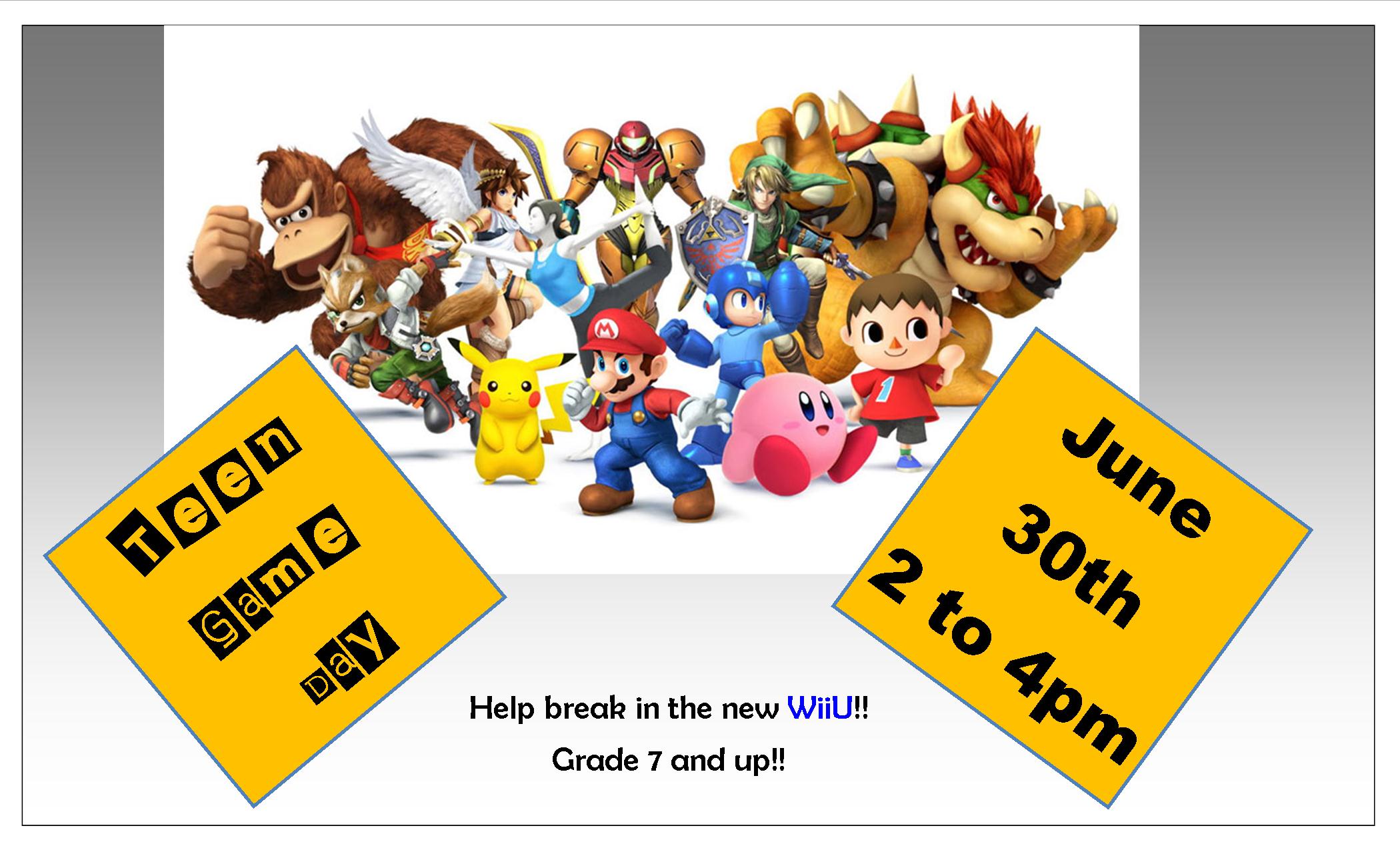 Teen Game Day is June 30th from 2-4 p.m. Grades 7 and up.
