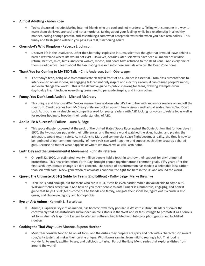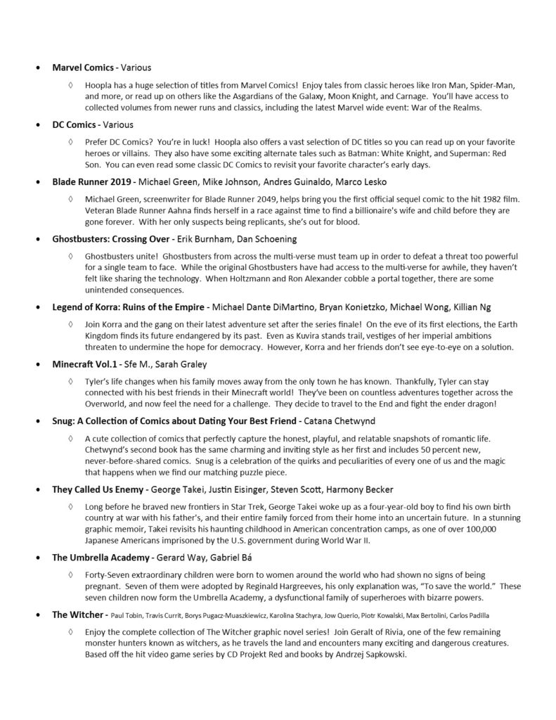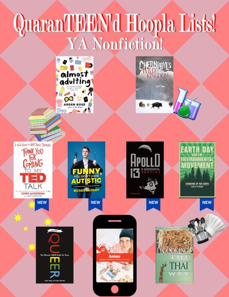 Click here!The nominees for YALSA’s Teens’ Top Ten list have been released! Need a new book to read or audiobook to listen to? We’ve already checked hoopla and Libby for you! Look for either catalog’s icon beneath a title, and you’ll know where to go to borrow it!