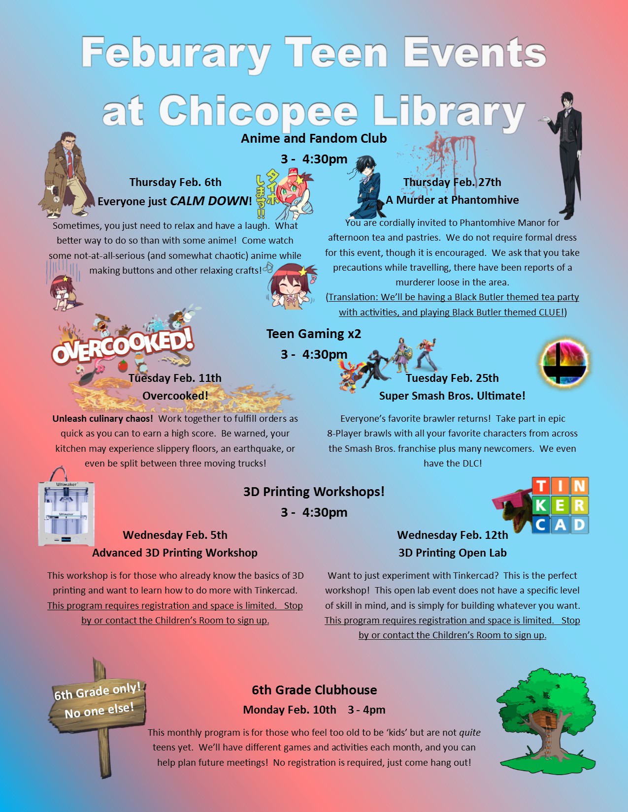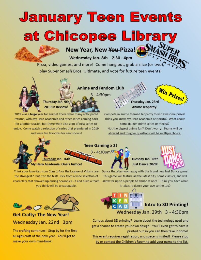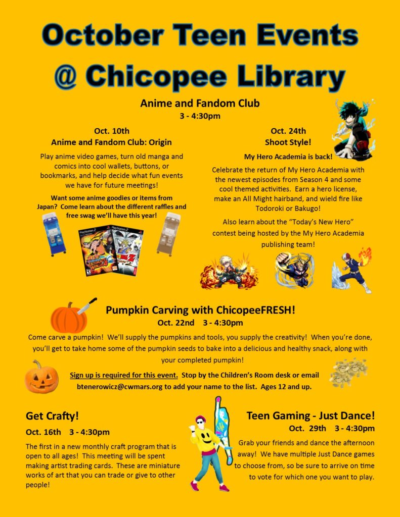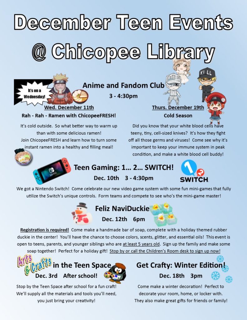Use our brand-new Request Form to get a personalized book bundle! We can pick out some great chapter books or some comic and manga titles! You can help personalize the bundle by letting us know what you feel like reading, or you can choose one of our themed book bundles for a mystery selection! We even have the Anime + Manga Swag Bundle that will give you two random series, the first season of an anime or a movie (when available), and a random piece of swag from our Anime Club prize box! Please note: A library card is needed to check out the bundles, and a curbside appointment must be made to pick them up. Please give us a call and we can help reactivate your library card if needed.